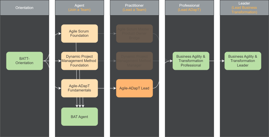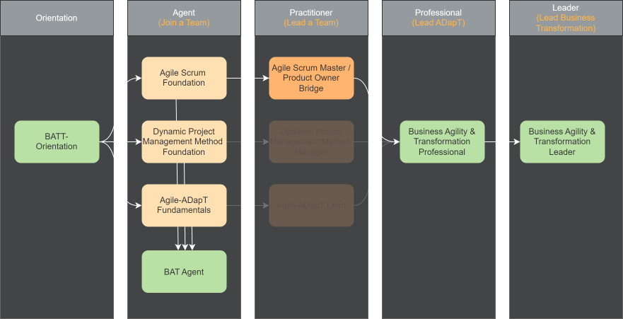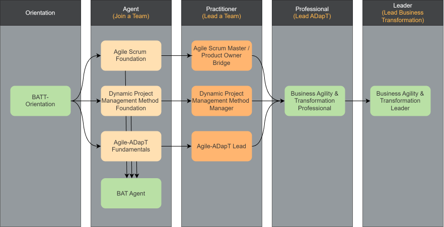 Your journey begins with the BAT orientation (optional) and foundational training in Scrum, as well as Agile-ADapT and Dynamic Project Management. Throughout the program, you will be trained as a Scrum Master and Product Owner and receive certifications as an EXIN Agile Scrum Master and EXIN Agile Scrum Product Owner Bridge. The BAT-Professional training prepares Scrum Masters and Product Owners to expand their influence within the context of business transformation and ADapT.